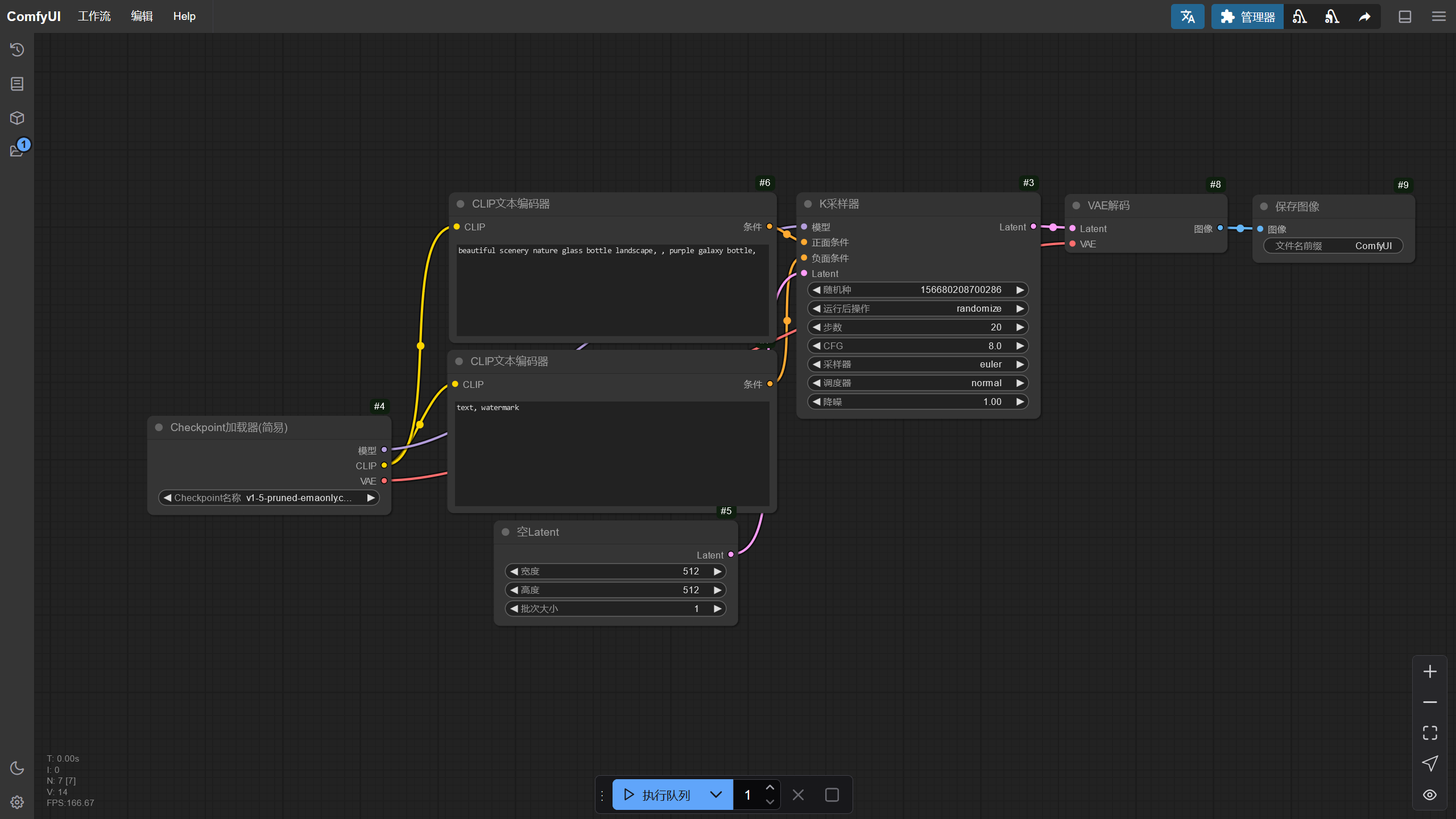 下面是一个简单的生图工作流,可以看到该工作流有许多节点组成。