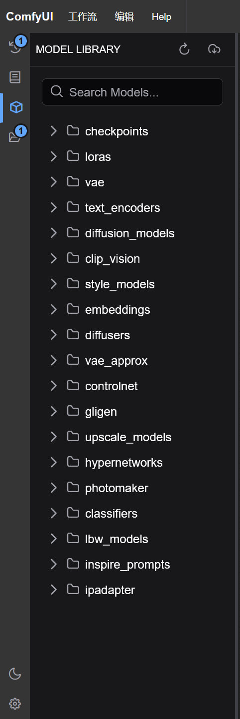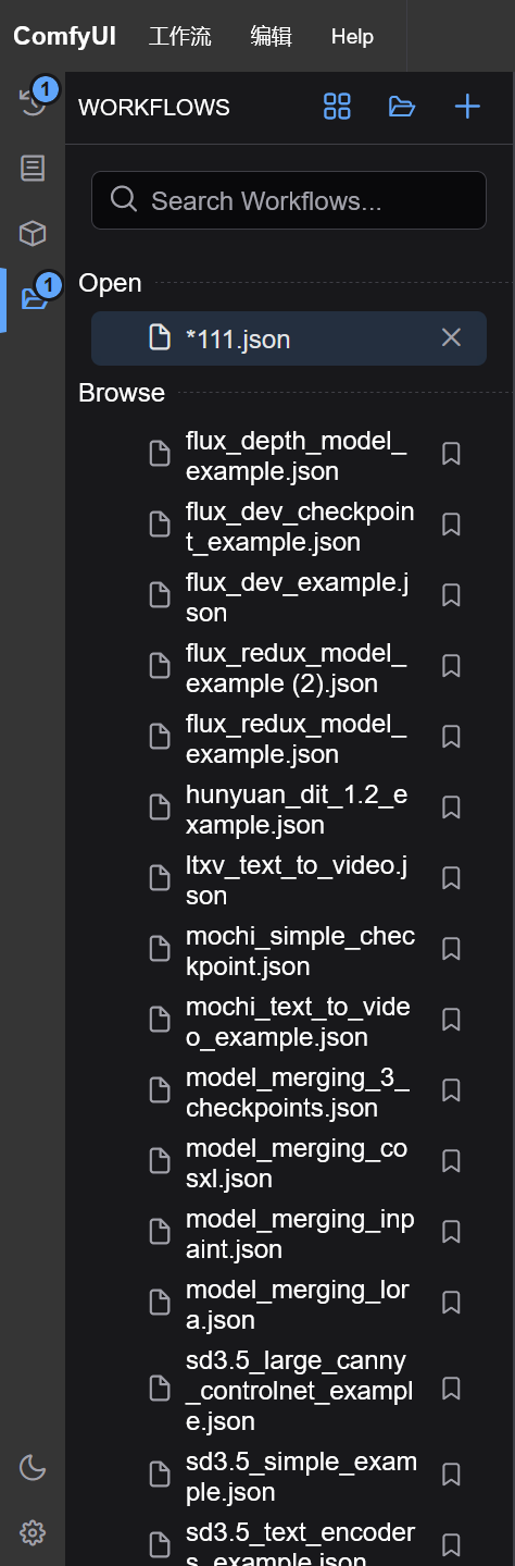 | 作用 | 显示关于工作流的操作。 | 显示编辑工作流的功能。 | 获取 ComfyUI 帮助。 | 显示 ComfyUI 运行日志。 | 隐藏 / 显示 ComfyUI 工具栏。 |