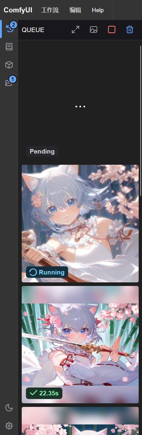 ComfyUI 的工具栏包含了一些快捷按钮,如 执行队列,这个按钮就类似 Stable Diffusion WebUI 中的生成按钮。