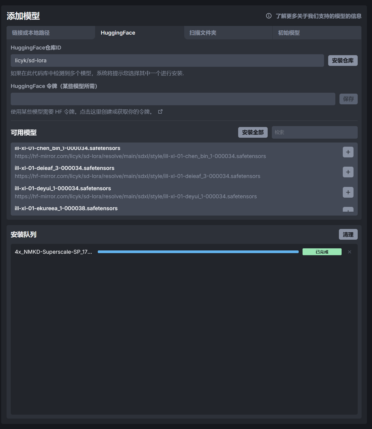 比如一个模型的 HuggingFace 仓库的地址为 https://huggingface.co/licyk/sd-lora,则该仓库的 ID 为licyk/sd-lora,填写 ID 并点击安装仓库即可安装该仓库中的模型。因为该仓库中包含多个模型,所以 InvokeAI 不会直接安装该仓库中所有的模型,而是在可用模型中展示仓库中的模型,点击 + 号可以安装该仓库中其中一个模型。