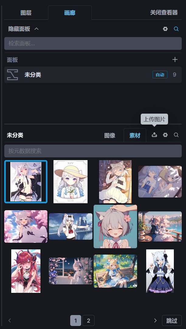 画廊支持对图片进行分类,当图片数量过多时,可以创建不同的分类对图片进行分类存放,点击面板选项里的+号可以创建新的分类,将鼠标移动到分类面板的名称上将显示一个按钮用于修改名称。