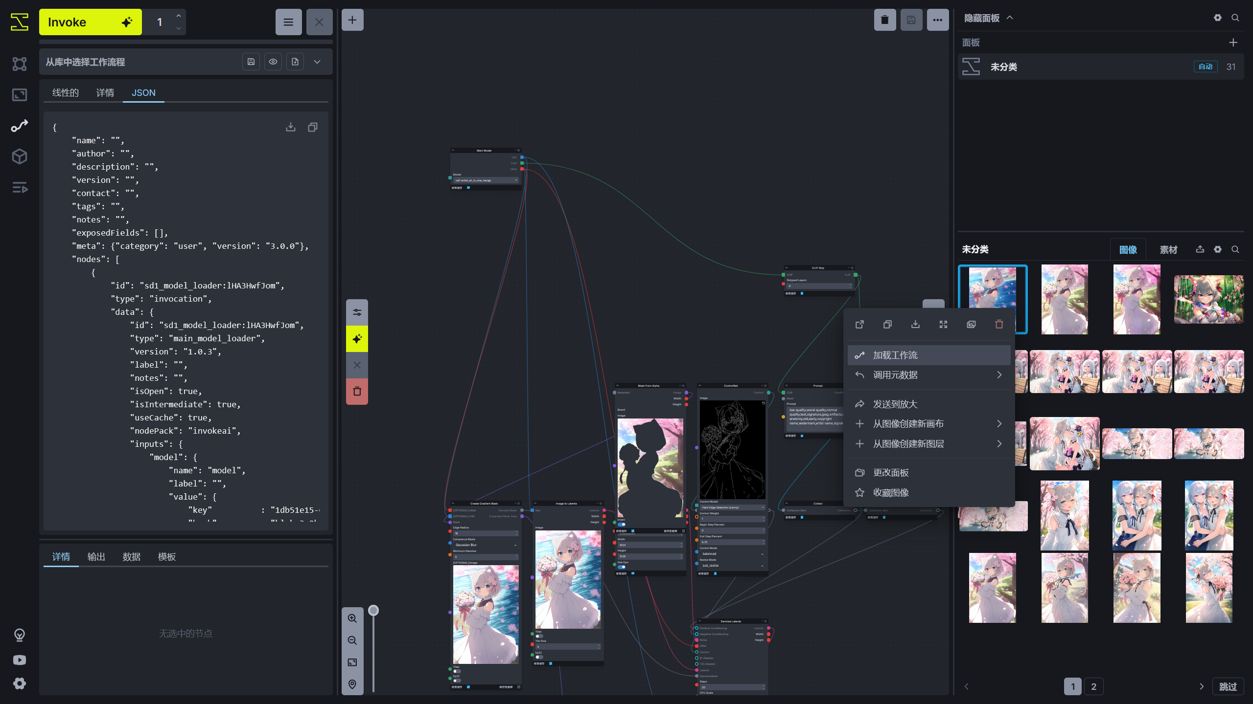 InvokeAI 除了提供统一画布进行图片创作,还提供了类似 ComfyUI 的工作流系统进行图片创作。