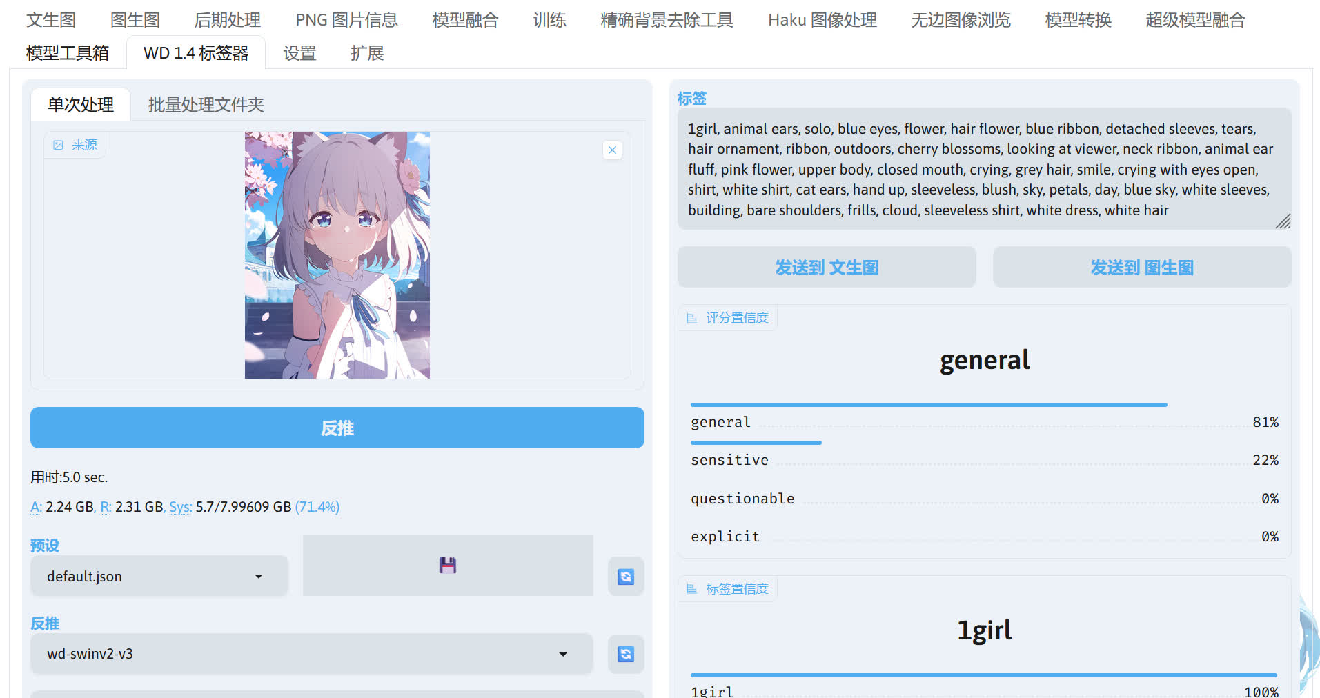 当看到一张比较好看的图片,想知道那张图片的提示词怎么写,可以通过 sd-webui-wd14-tagger 扩展将提示词反推出来。使用前建议将将结果中的括号进行转义处理和反推完成后卸载模型,再将图片导入左边的图片导入框,导入后扩展将自动反推提示词,如果没有进行反推提示词可以手动点击反推。