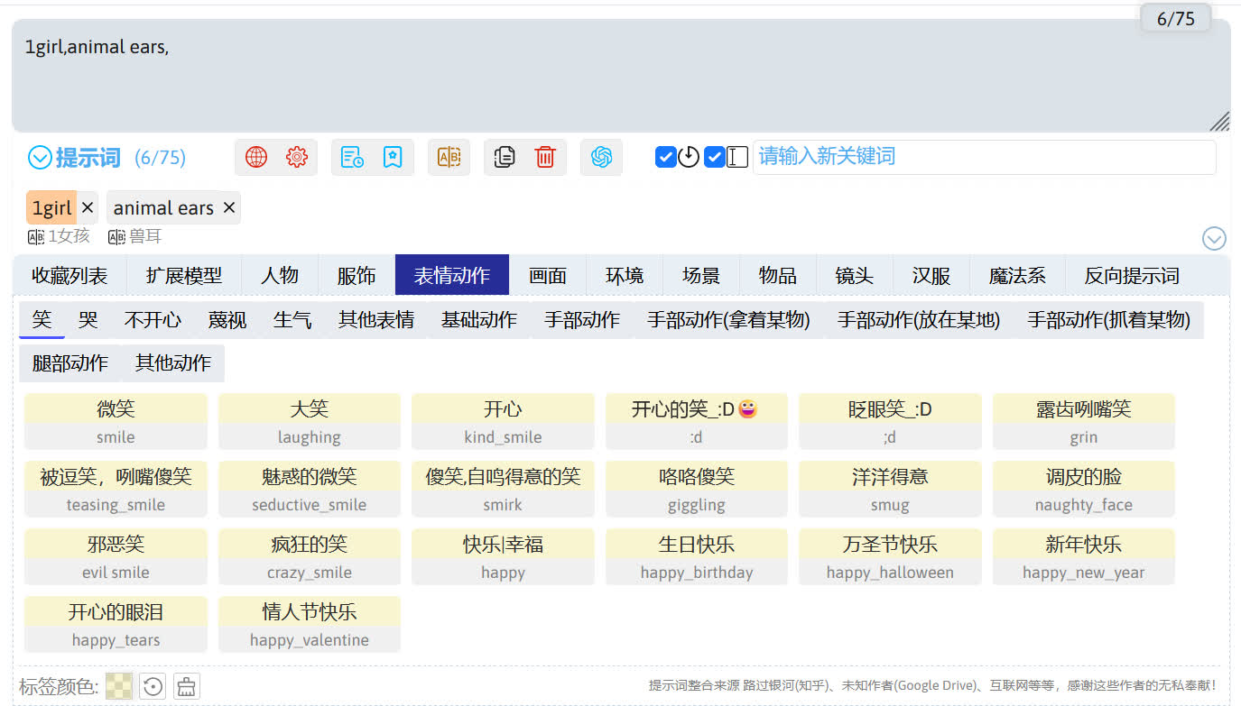 如果对英文不熟悉,也可以通过 sd-webui-prompt-all-in-one 扩展输入提示词。点击左下角的按钮即可展开提示词列表,单击列表中的其中一个提示词就可以把输入到提示词框中。